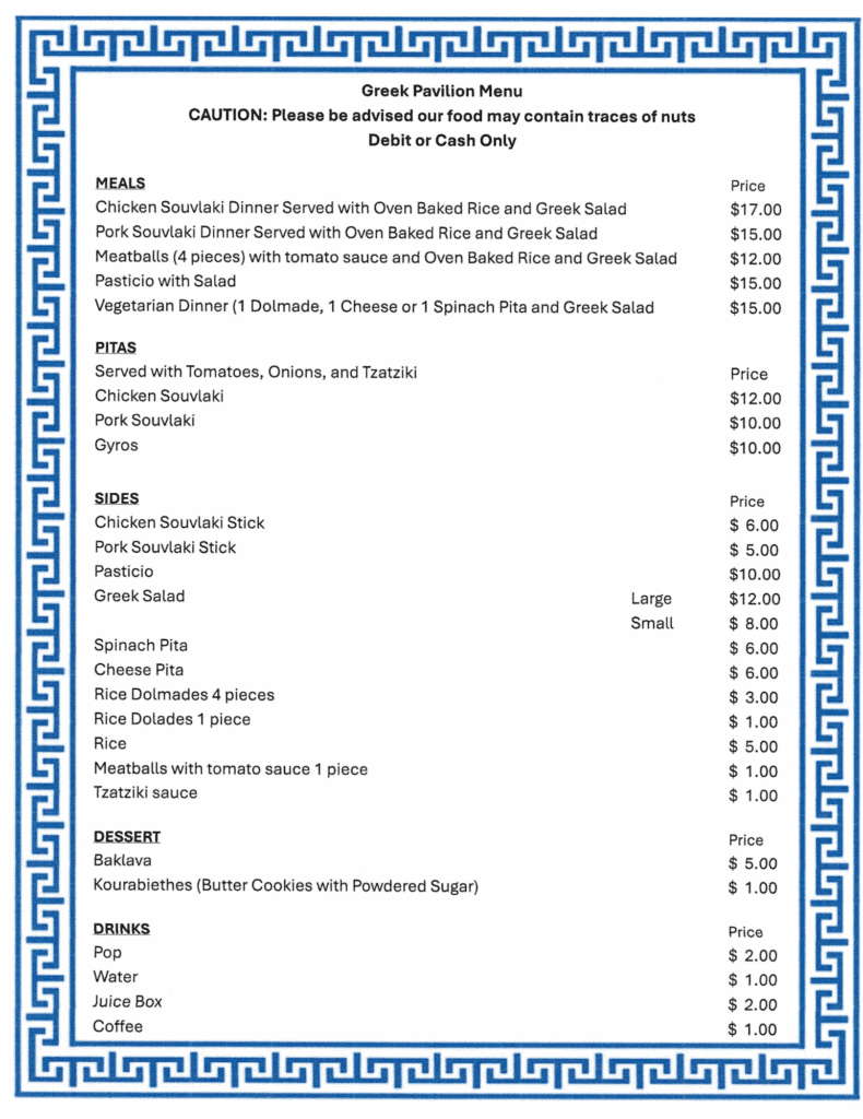 The Acropolis Pavilion is back at Fiesta Week, and we couldn’t be more excited! After a few years away, we’re thrilled to once again share the spirit of Greece with Oshawa. Join us for an unforgettable experience filled with traditional souvlaki, sweet baklava, lively Greek music, and high-energy folk dancing. Whether you’re shouting opa! with the dancers or savoring every bite of homemade cuisine, the Acropolis Pavilion promises a warm welcome and a true taste of Greece.